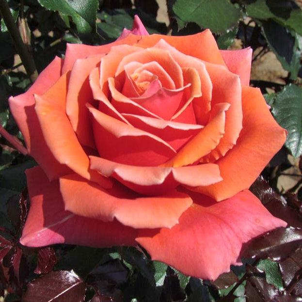 Copper Light has fresh, deep violet-green foliage that beautifully highlights the luxurious medium-sized blooms in warm copper tones. The flowers appear singly or in small clusters on stems with sparse, small thorns. The bushes are upright. This rose has excellent health, begins to bloom early, and repeats well until late autumn. This absolutely fantastic rose is undoubtedly one of the best among the many original varieties bred.