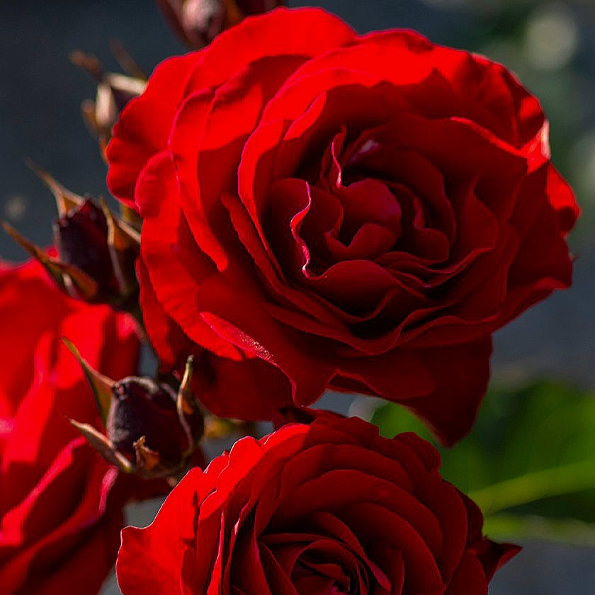 This profusely blooming floribunda produces semi-double or double cup-shaped rosettes about 7-8 cm in diameter of a very pure red color. Fully open flowers are accented by a cluster of bright yellow stamens in the center. Large flower clusters appear from early summer until the first frosts. The fragrance is light. Europeana’s foliage unusually retains its red tint for a long time, turning dark green only just before the flowers at the shoot tips open. The bush is dense, rounded, 80-90 cm tall and 80 cm wide. It is perfect for flower beds, borders, and grows well in containers.