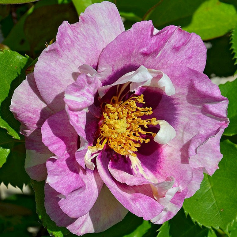 This rose has quite compact flower clusters containing up to 10 buds. When they fully open, a very compact bouquet is formed, consisting of only one stem. The rose is not afraid of prolonged rain or heat in the sun. Interestingly, the white petals of the rose can become slightly pink when the temperature drops, but a prolonged lack of sunlight causes the flowers to open only halfway, hiding the yellow stamens behind the inner layer of petals, while maintaining the "signature" color transition from white to deep purple.