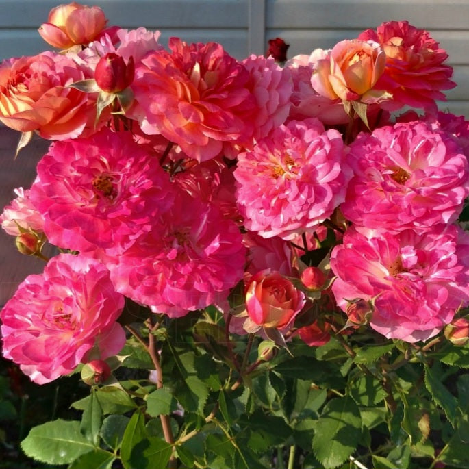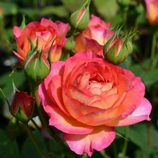 A rose with very beautiful flowers. Bright, saturated colors. A wonderful combination of red-pink and yellow. When the flower fades, the reverse side loses its pattern and becomes reddish.