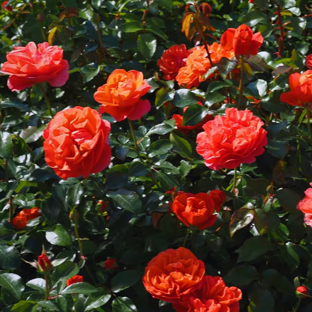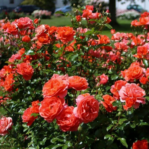 Semi-double flowers of Theodor Fontane bloom in numerous inflorescences, initially bright orange, then changing color to pink. The petals are very strong, so the flowers are resistant to rain. The rose has many shoots, which helps it grow into beautiful, compact bushes. The fragrance is light. The flowering is repeated. The foliage is highly resistant to powdery mildew and black spot.