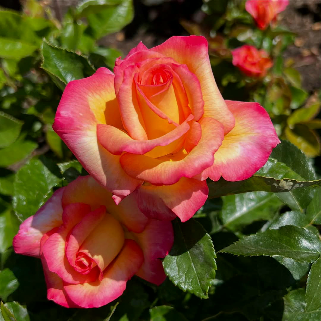 Ziedi ir lieli, dubulti, ar augstu vidu, augstu novietoti uz dzinumiem un bieži vien atsevišķi. Dzeltens ar sarkanu maliņu ziedi ir ar spēcīgu aromātu un sniedz dārzam ilgi gaidītu krāsu uzplaiksnījumu. Lapas ir veselīgas, tumši zaļas, pusspīdīgas, izturīgas pret slimībām. Zied biežās viļņos, praktiski nepārtraukti visa sezonas garumā.
