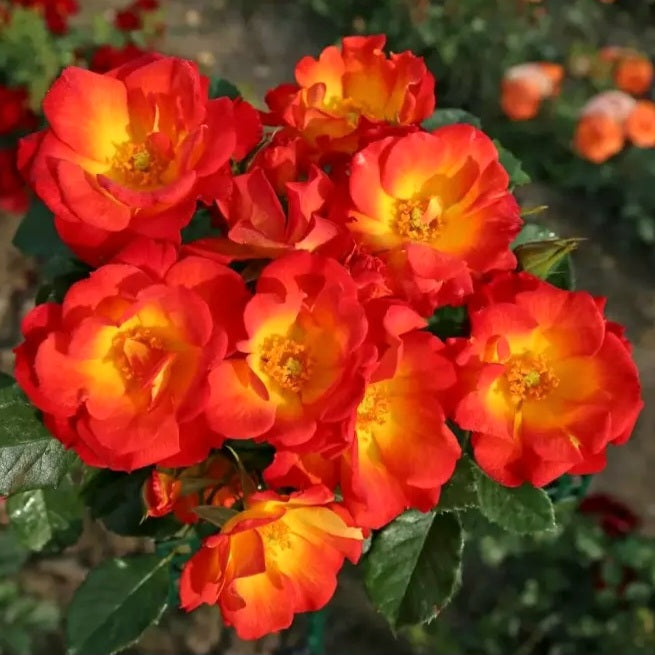 Koši oranžā krāsā ar dzeltenu vidu. Ziedi ir intensīvā krāsā, vidēja lieluma, vienkārši, atvērti, savākti lielās ziedkopās. Roze zied bagātīgi un gandrīz nepārtraukti līdz vēlam rudenim. Šķirne ir veselīgām, ādainām slimību neuzņēmīgām lapām.