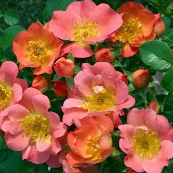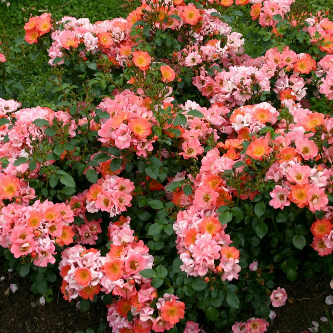 Очень компактная и устойчивая к болезням миниатюрная роза с отдельными цветками, устойчивая к жаре и дождю, очень гармоничного цвета, с яркими золотистыми тычинками. Цветки лососево-оранжевые или лососево-розовые.