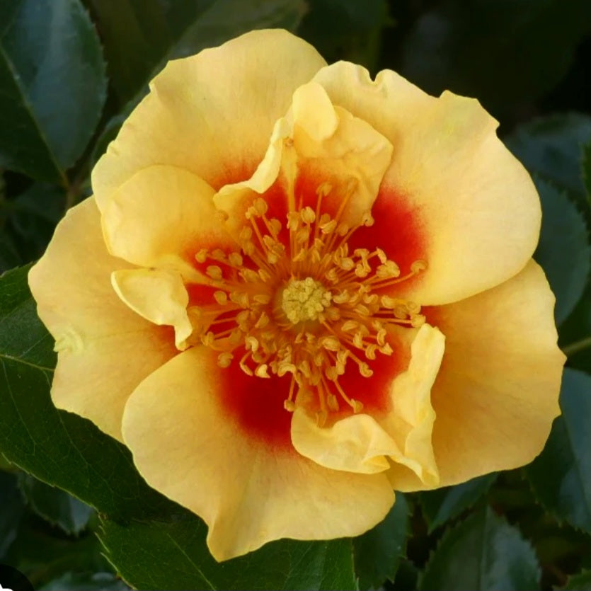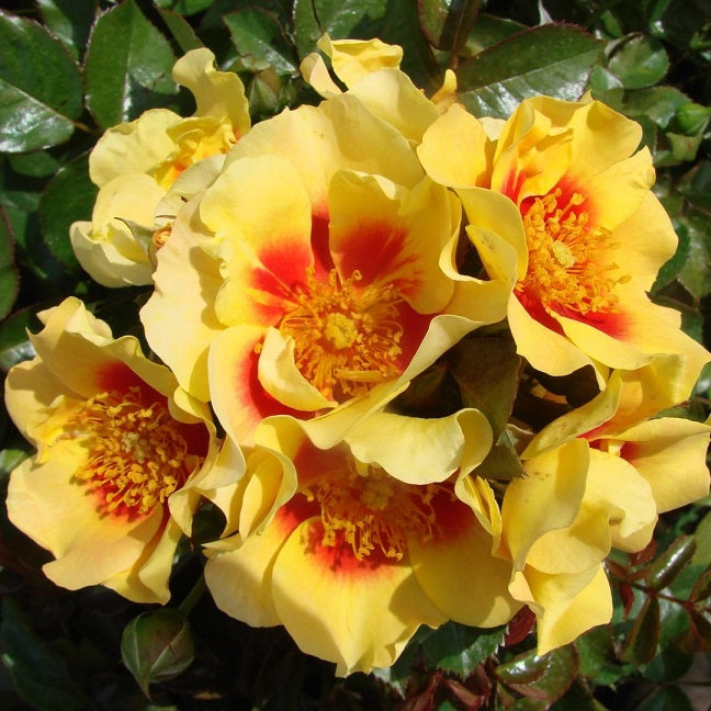 Цветки простые. От абрикосово-жёлтого оттенка до ярко-жёлтого с насыщенным красным центром. Обильное цветение, повторяющееся всё лето.