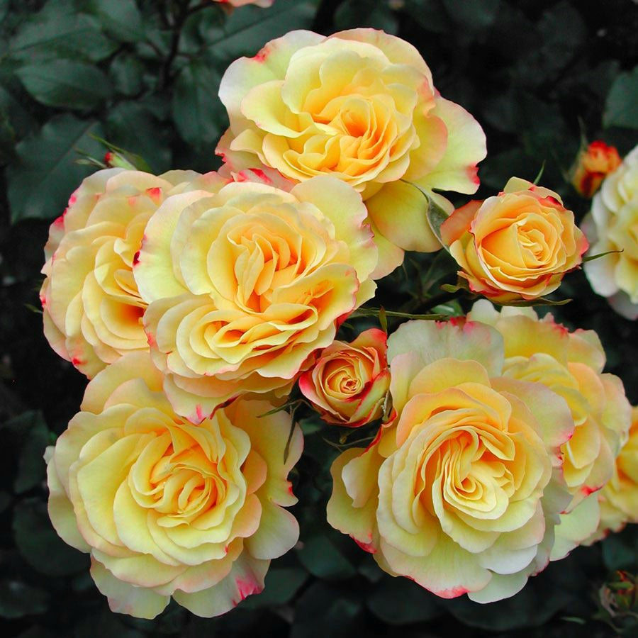 Изысканная флорибунда, выведенная в Новой Зеландии. Она очень приметна своими волнистыми лепестками. Цветки желтые с розово-красными краями, становящиеся более розовыми с возрастом. Количество лепестков на цветке 17-25 шт. Роза обладает хорошим ароматом и очень здоровой, темно-зеленой, глянцевой листвой. Устойчива к болезням.