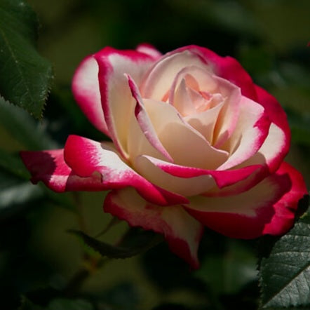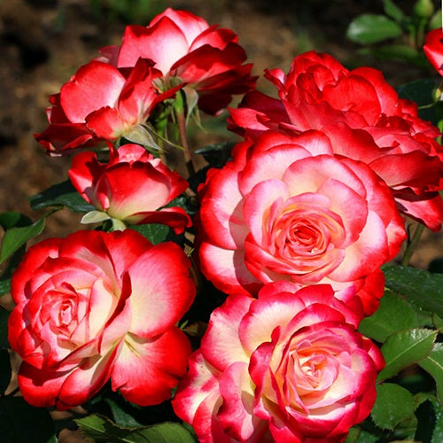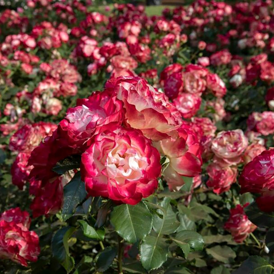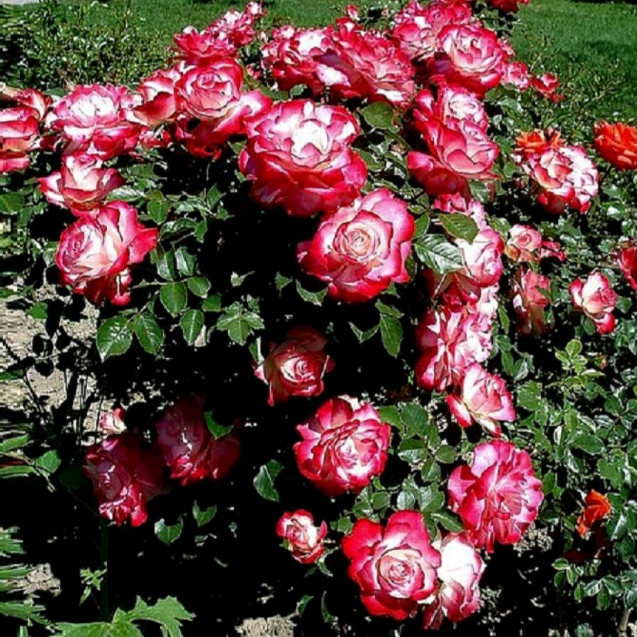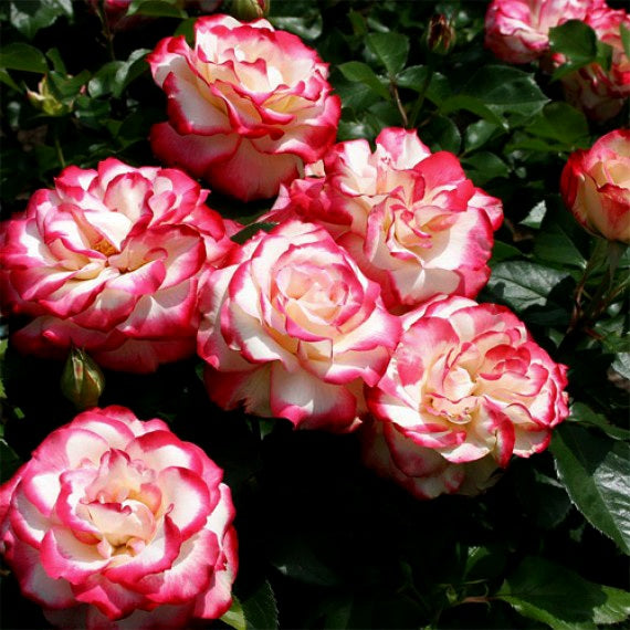 Эта эффектная роза покоряет красотой цветка. В полуроспуске бело-кремовые лепестки окантованы нежной малиновой каймой, которая по мере раскрытия цветка расширяется, а ее интенсивность усиливается до вишневой. Цветки крупные, махровые, долго сохраняют прекрасную форму. Компактные кусты высотой до 70-90 см. с плотной матовой листвой, выглядят опрятно в любое время.