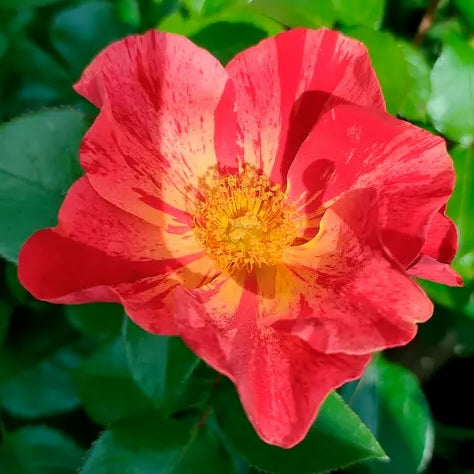 Удивительно эффектный сорт. Роза выделяется тем, что почти каждый цветок немного отличается от соседнего. Цветки ярко-красные или тёмно-розовые со сплошными карминно-красными полосками и бледно-жёлтым центром. Цветки диаметром 6-7 см, простые, шестилепестные, но очень прочные, в соцветиях от 5 до 10 шт. Аромат умеренный. Листья большие, глянцевые, тёмно-зелёные с бронзовым оттенком, устойчивые к заболеваниям. Кусты пряморослые, густые, высотой около 70-80 см, шириной 50-60 см. Цветение непрерывное в течение сезона.