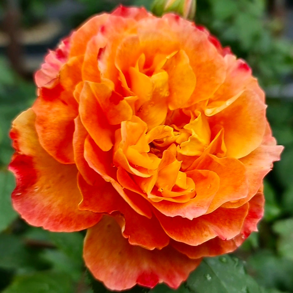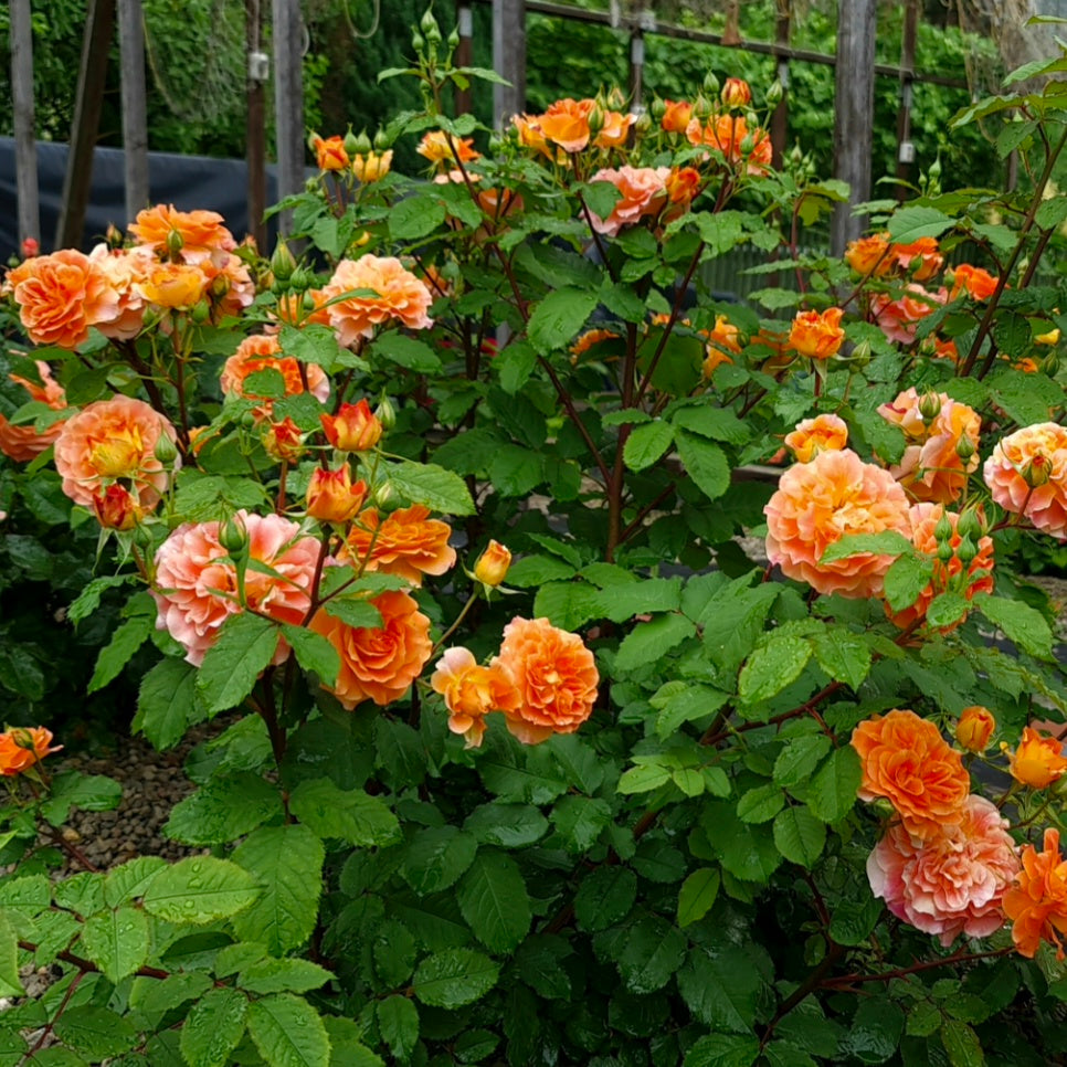 Цвет розы изменчивый, смешанный с несколькими оттенками — оранжевый, коралловый, жёлтый. Цветки густо наполненные, большие, с волнистыми лепестками. Роза обладает сильным фруктовым ароматом. Цветы раскрываются медленно, отлично выдерживают как солнце, так и дождь. Куст раскидистый, округлой формы с блестящими листьями.