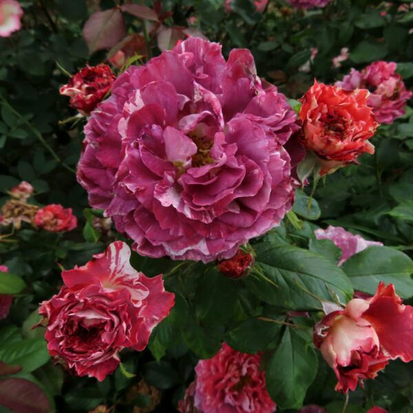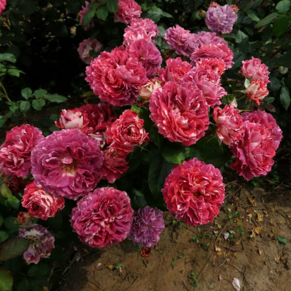 Очень необычная роза с сильно зубчатыми краями лепестков. В начале цветки лиловые с сиреневыми тонами и кремовыми крапинками, серебристые с обратной стороны, с желтым центром и реверсом цвета слоновой кости. С возрастом цвет меняется до сумеречной лаванды с сиреневыми и розовыми тонами и терракотовыми оттенками с кремовыми мазками и серебристым реверсом.